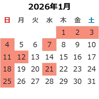 赤色の背景の日は休診日です。